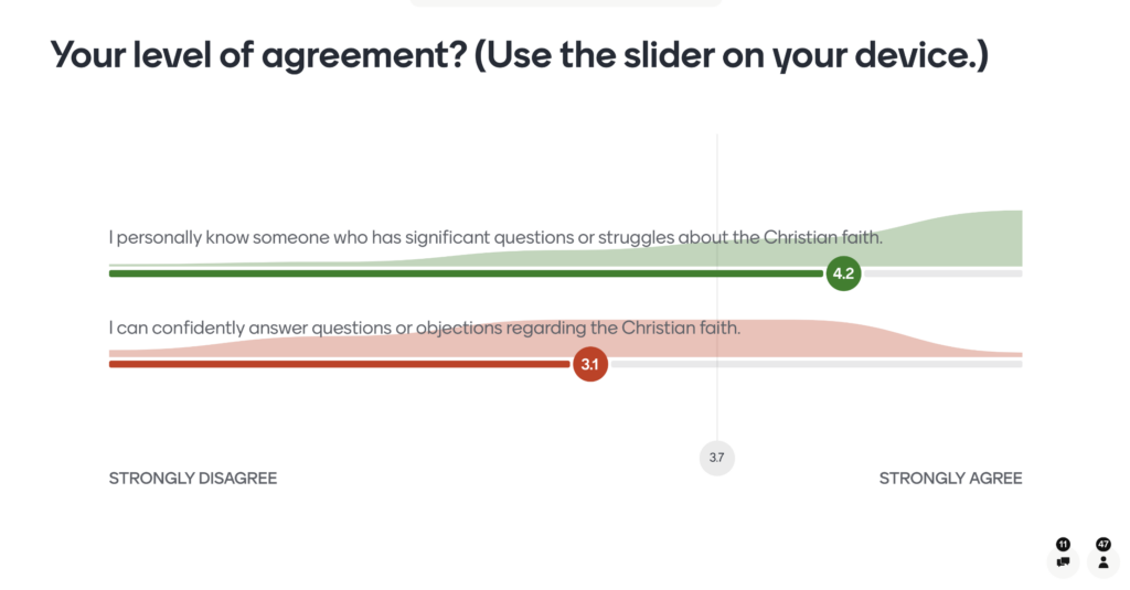 - Some results from Mentimeter responses. A key takeaway: The audience personally knew more people who have questions and struggles about their faith than they feel confident to answer their questions or objections. One inference? We need better training to be better prepared.
